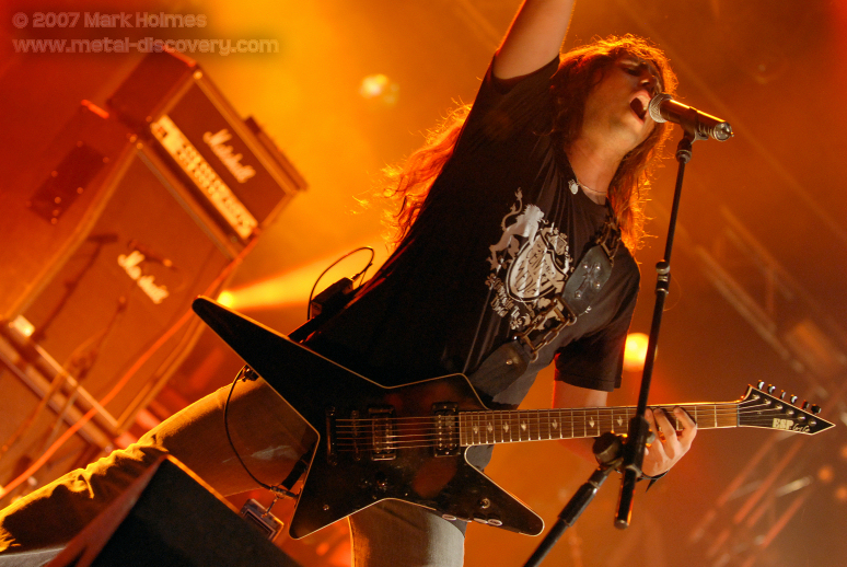 Hailing from Greece, Firewind attract the largest crowd of the day so far at the main stage just prior to their performance which is indicative of the band's rising popularity in the UK. A couple of weeks before the festival, it was revealed in a statement issued by Firewind's guitarist Gus G. that their regular vocalist Apollo would be 'taking the next few months off' as he was experiencing 'some problems back home', and that Henning Basse, the frontman from German band Metallium, would be temporarily recruited to fulfil touring commitments. Basse is thanked for this on stage as it enabled Firewind to honour their appearance at BOA to which the crowd cheer in appreciation. Their music is rooted in the power metal subgenre although with progressive overtones and virtuoso musicianship which, during their performance, manifests in the breathtaking fretboard widdlings of guitarists Gus G and Bob Katsionis, with the latter occasionally playing guitar and keyboard simultaneously reminiscent of Michael Angelo's ambidextrous 'Double Guitar' solos. At times, the songs seem secondary to these guitar virtuosi; merely excuses for displays of their masterful technique à la Yngwie Malmsteen with his 'band'. However, the songs, albeit very unoriginal and infused with Euro-cheese, are strong enough to sustain interest in their set. Basse does a remarkable job as stand-in vocalist and the BOA audience appear to warm to him as Firewind's temporary frontman. Overall, nothing original here, but nonetheless a very enjoyable performance.
