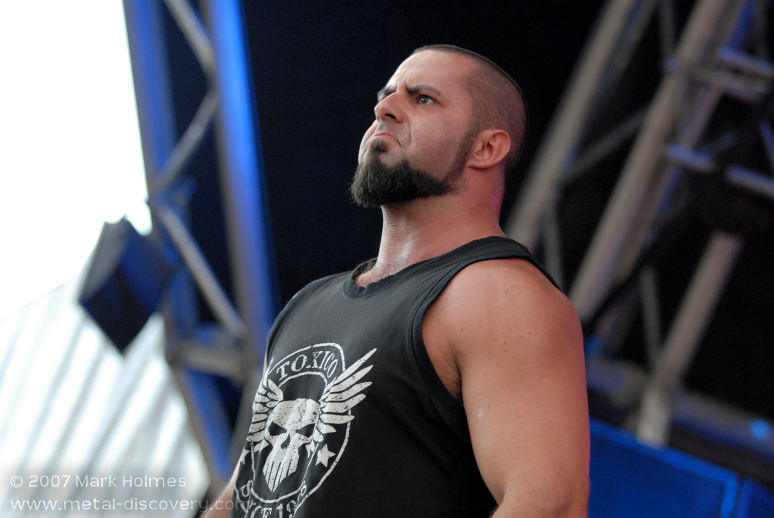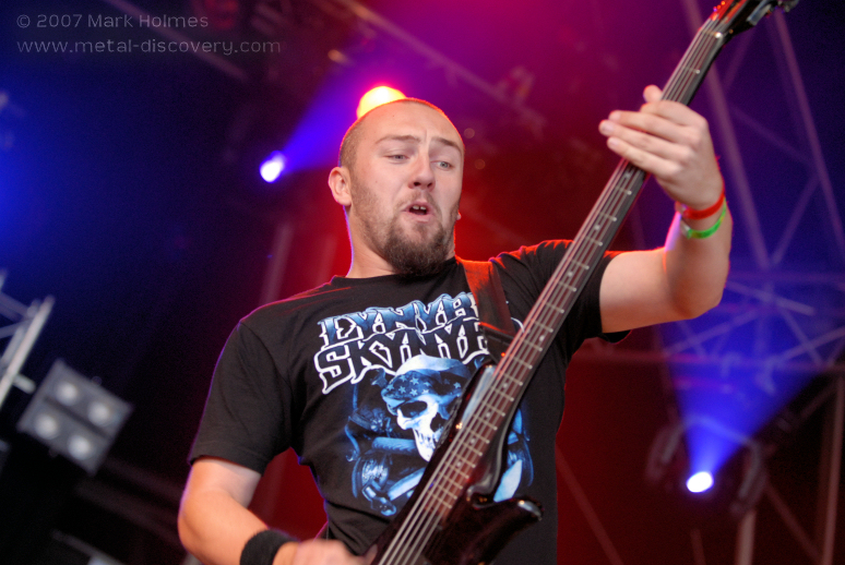 With time having been made up from earlier delays, this is then compromised by an unnecessarily overlong soundcheck by the roadies of Thursday headliners, Californian thrash legends Testament. Such lengthy soundchecks always seem rather futile as setting levels for instruments in complete isolation from each other is no test as to how they'll actually sound when played together, such is the case when the band appear on stage and launch into opener 'The Preacher' from 1988 album 'The New Order'. Drums are almost entirely lost in the mix, with only a very tinny sounding snare audible, and guitars are far too loud which simultaneously distort the PA speakers and drown out Chuck Billy's vocals. In direct contrast to Firewind, Testament sound completely abysmal through the PA for the first 3-4 songs, and this coupled with the strong bias on back lighting and a rampant smoke machine that renders the band as only murky silhouettes, abates the impact of their stage entrance. When the sound problems are rectified and band members become more visible, Testament are an impressive live act in 2007. With the current lineup including all original members apart from original drummer Louie Clemente - ex-Cradle of Filth/Dimmu Borgir sticksman Nick Barker occupies the drum stall - the band's set includes material both old and new which is well received by the BOA audience. Initial sound problems aside, Testament prove themselves worthy headliners of the first day of Bloodstock.