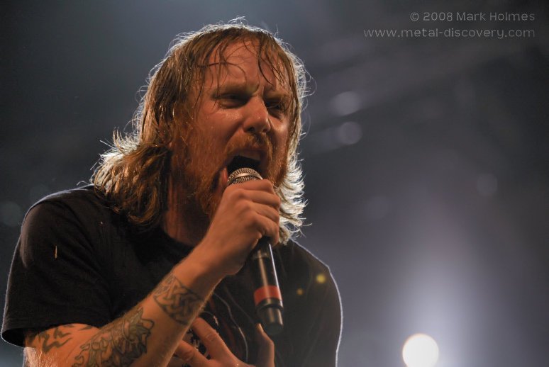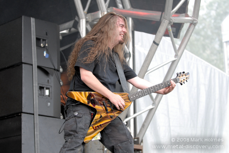 The past 3-4 years has seen some unexpected, although very welcome reunions in the metal world - Atheist; Emperor; Sabbat; Cynic; Carcass....and At The Gates. Discovering At The Gates back in 1995 with the release of their seminal work, and final album, 'Slaughter of the Soul', widely regarded by many to epitomise the Gothenburg melo-death subgenre they'd already helped create along with peers In Flames and Dark Tranquillity, I'd never had the chance to see them live as a year later saw the band unexpectedly split. Their addition to the Bloodstock bill was, therefore, most welcome, particularly as the reunited band members are those from the classic 'Slaughter of the Soul' era. A few minutes before the Swedes are due on stage, it unfortunately begins to rain rather heavily, the first real showers of the day. However, a determined crowd refuse to let this dampen their enjoyment and unique opportunity of catching At The Gates live in this exclusive UK appearance, as when the band emerge on stage after a slightly overlong soundcheck and open with the title track from 'Slaughter of the Soul', large, intense pits begin with accompanying widespread crowd surfing. Utilising their hour long time slot well, charismatic frontman Tomas Lindberg informs the audience early on that they'll be playing something from every At The Gates release although the bias is predictably towards 'Slaughter of the Soul' - 'Under a Serpent Sun', 'Cold', 'World of Lies' etc sound as relevant and fresh in 2008 as in their original recorded incarnations back in 1995. With the exception of guitarist Martin Larsson, all other band members have remained musically active over the years, so it is no surprise that they each look comfortable onstage performing enthusiastically in front of Bloodstock's huge audience, although I am seriously impressed by how tight they are as a live act in 2008. An incredibly good sound and mix through the PA helps matters, although with Larsson's guitar through the right channel, and Anders Björler's the left, only those standing central to the stage can properly benefit from the distinctive twin guitar harmonies characteristic of At The Gates' style. On stage for around forty five minutes, pre-encore set closer 'Need' sees them briefly disappear, only to re-emerge to the intro music from 'Blinded By Fear', as they treat a now very wet audience to this song and two more. It is a genuinely sad moment when Lindberg implicitly announces the reunion will not run for much longer and informs the crowd this will be the band's final appearance in the UK, also stating it brings a tear to his eye seeing so many people turn up to witness the Swedes' last ever UK show. He reaffirms this before closing encore track 'Kingdom Gone' by declaring it to be the final song they'll ever play in the UK. Judging by general audience reactions, I am not the only one moved by this moment of finality, and when they cease playing, the final track from 'Slaughter...' - 'The Flames of the End' - is played through the PA, apposite outro music, almost as if it was named and written all those years ago for such a future occasion. The moment is both symbolic and poignant. On the positive side, five minutes after At The Gates exit the stage, the heavy rain that has lasted for the duration of their set finally stops!