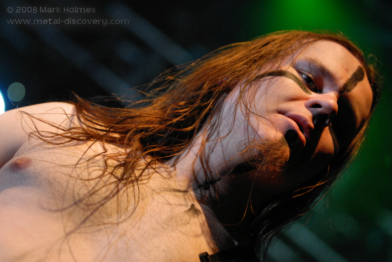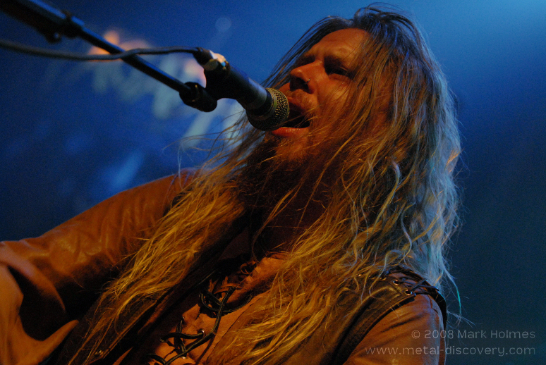 Opening Paganfest are Napalm signings Tır from the Faroe Islands. Having only recently heard their latest release, 2006's excellent 'Ragnarok' album, I'd been impressed with their progressive and original take on the currently booming folk metal genre. With the Koko already half-full, the Faroese metal warriors play a short set of five songs amounting to only around 25 minutes, though do a fine job of warming up the crowd. Musically, I cannot fault Tır, and their unique brand of prog-folk metal translates well to the live stage, with particularly impressive vocal harmonies, although their overall delivery of the material is a little lacklustre. Frontman Heri Joensen is a lively performer, and effective at working the crowd into their first movement of the day, although his fellow bandmates are comparatively more subdued on stage and far less animated. Overall though, Tır are a solid opening act, and are well received by the Koko audience.