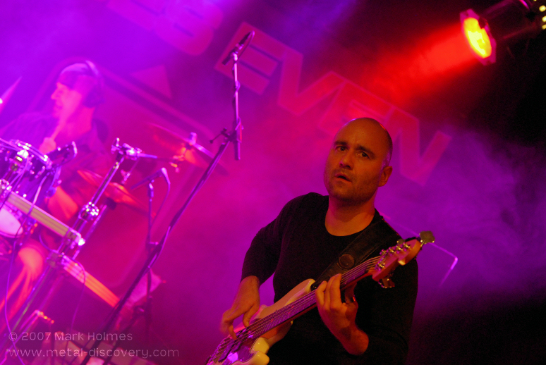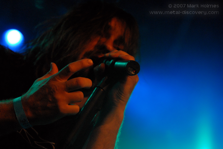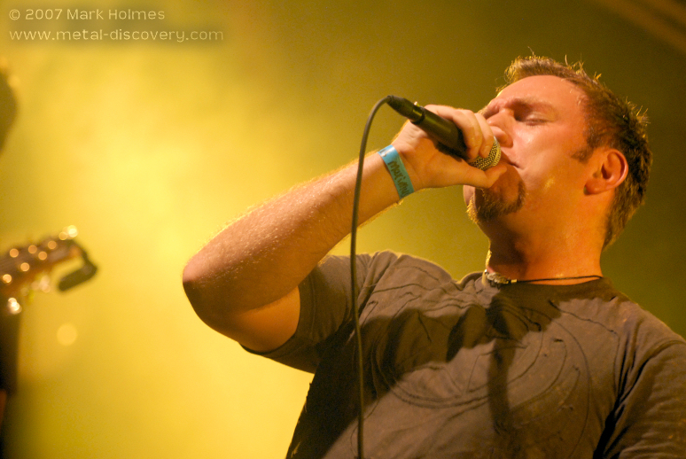 Commencing Sunday's proceedings are young Dutch unsigned band Day Six. Originally appearing at the festival's pre-party back in 2004 down in the Sjiwa basement, they have come a long way in 3 years and are bestowed the honour of a main stage slot in 2007. Labelling their own music as 'Progressive Symphonic Metal', their songs encompass a whole array of their self-professed prog influences including Pink Floyd; Pain of Salvation; Porcupine Tree; Dream Theater; Nevermore; Spock's Beard; Blackfield, etc. Frontman Robbie van Stiphout is a dynamic performer with the widest range of maniacal facial expressions the festival has witnessed since Devin Townsend's memorable performance in 2004. However, with the smallish crowd enjoying Day Six's music as much as the band appear to be performing it, 3 songs into their set and the festival experiences its first ever power failure in its 9 year history. No sound; no lights; no power at all! Rumours abound as to how this occurred involving the bass player from a particular band, but whatever the reason, the organisation are to be commended for rectifying the situation after only a ten minute delay, as are Day Six for their professionalism at finishing their set undeterred when the power has been fully restored. As much as I enjoy Day Six's music, my only minor criticism is that their songs sound occasionally cluttered as if they're trying to pastiche all of their influences within a single composition. However, they are technically impressive musicians, talented live performers, and deserve their music to be heard by a wider audience.