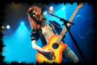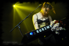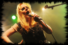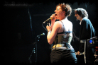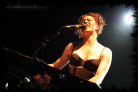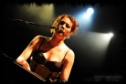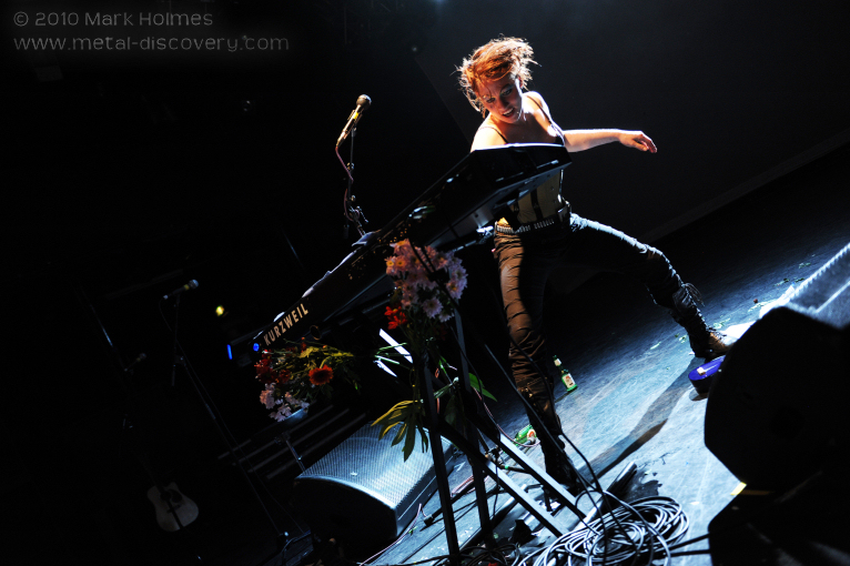 Next up is Melissa Auf der Maur, onetime Hole and The Smashing Pumpkins bassist. Introduced by Amanda as another stranded victim of the unbiquitously disruptive ash cloud, she should have been back in the States by tonight although, with gear borrowed from Robots in Disguise by herself and her band, is another last minute addition to the Koko bill. Apparently, she also played a spontaneous gig in Camden's Jazz Café last night where Amanda joined her onstage, equipped with ukelele, for a couple of songs. With tonight's show being broadcast live on the internet, Melissa admits to the audience she is a "webcast virgin" so it's perhaps a little ironic that there transpired to be no live feed for the entirety of her set. Her performance is, therefore, a more exclusive experience for those present in the Koko this evening and she treats the crowd to a short set consisting of 'Taste You', 'Out of Our Minds (OOOM)', '22 Below', 'Followed the Waves' and closing number 'Overpower Thee'. I guess related to the webcast glitch and attempts to rectify it, a guy runs on mid-set to whisper something into Melissa's ear before scurrying back off stage, then she informs the audience that she let him have the password to her laptop at his request, "so now he has access to all my emails, photos, videos...!" Many present are discernibly excited by Melissa's presence onstage and, as with Robots in Disguise, it's perhaps somewhat of a rare chance to hear her tunes performed live in a stripped down acoustic guise. Her drummer, however, does look a little bored in just having a cajón to slap, but collectively they put on one hell of a great show with their short, off the cuff set.