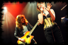 Considering tonight's show had been 'assembled' pretty last minute with support acts recruited at the eleventh hour, the smooth organisation and quick change over times are something of a surprise. Literally seconds after Bitter Ruin vacate the stage, Amanda appears once again and informs the audience - "For those who just came you're not going to see Evelyn Evelyn - instead, you're gonna see this stupid bitch Amanda Palmer!", then proceeds to say how excited she is to introduce the next band with "a very special acoustic set". It is, of course, Robots in Disguise, perhaps famed more for their appearances in 'The Mighty Boosh' than their own music. Having never seen the Julian Barratt/Noel Fielding TV show, or previously been aware of the girls' usual electropunk discharge, I witness their performance this evening through objective ears and eyes. Stripped down acousto-centric punk is on offer from these ladies tonight with the core lineup of guitarist/vocalist Dee Plume and bassist/vocalist Sue Denim joined by percussionist Ann Droid (aka Gemma Hill) who sits behind them beating the shit out of her cajón drum. As they spend a couple of minutes untangling and plugging in leads, they inform the crowd - "We're Robots in Disguise...in disguise as a folk trio!", prompting much laughter around the Koko. With Dee and Sue quasi-attired as air hostesses, the three musicians open with freshly available download-only single 'Wake Up', followed by what's introduced as their next single, 'Chains', both of which they state they're trying to get to number one. Having never heard the original versions of these tracks, I have no point of comparison with their live incarnations this evening, or indeed their viability to top the charts, although as far as acoustic-based punk goes it's an enjoyable turn in a night of disparate music. The audience think so too judging by the warm reception they offer Robots in Disguise with loud cheers and applause in-between songs, and also at the close of their set.