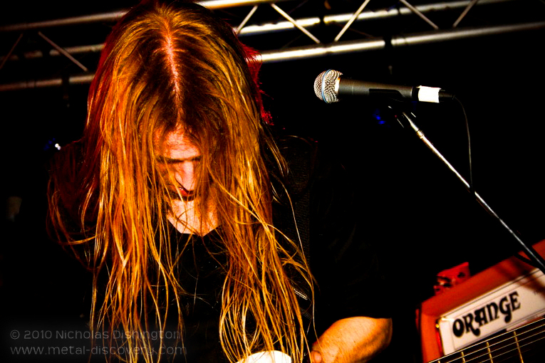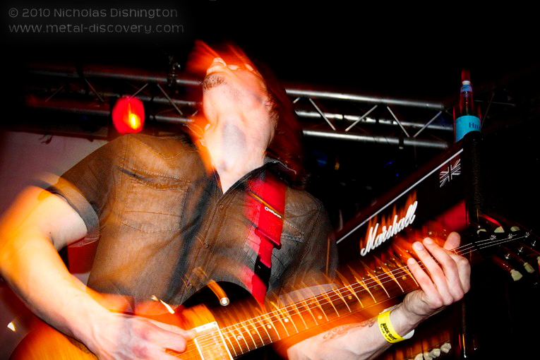 Entering to the epic overture of Juno Reactor’s ‘Navras’ (used famously in the final fight in ‘Matrix Revolutions’) I can’t help but be a little excited about Achilla. Breaking into their first song, ‘Arashi’, they make a strong impression, leaving more than a hint of Opeth in their wake. It isn’t until vocalist Martamaria opens her mouth that things turn for the worst. Technical difficulties has her singing in vain, with no vocals being heard even at the very front of the room. She bravely sings on for a couple of songs before it’s sorted but when she is finally heard it was like nails down a chalkboard, this time not due to technical difficulties. Her singing style is quasi-spoken with a jarringly flat tone which further puts a dampener on the proceedings. It’s a guilty pleasure when later on in the set the vocals cut out again as the rest of Achilla’s somewhat progressive sound was definitely nothing to complain about. Particular kudos go to guitarist Daniele Panza who is a fine example of a guitarist having a creative writing style with the technical abilities to match. Although not without their faults Achilla put on an emotive show tonight with a variety of pleasingly catchy songs.