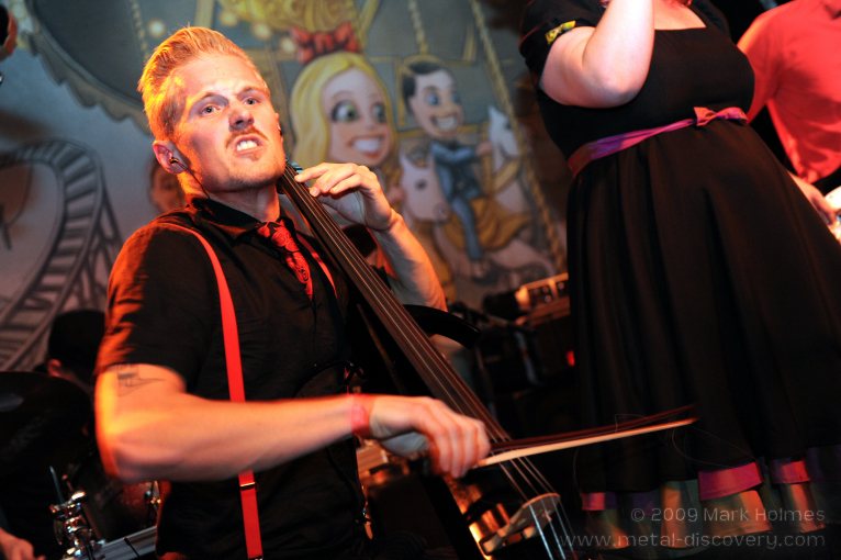 With the self-indulgent retro-boredom of Triaxis out of the way, it's finally time for tonight's main attraction in what is now an incredibly hot and sweaty venue. Signs on the door announce the gig has sold out, so it's evident many have been eagerly anticipating the debut UK performance of Diablo Swing Orchestra (which, effectively, should have occurred last year had ProgPower UK not been cancelled due to poor ticket sales). In fact, beyond the UK, some dedicated fans have travelled from as far away as northern Sweden to witness DSO in action at what has been billed as an album release show. Also, as a side note, I discovered earlier in the evening that the man responsible for tonight, one Lee Barrett, capped ticket sales at thirty short of the venue's capacity to prevent the Purple Turtle from becoming overly crowded. A most considerate man! And it does take the edge off what would have otherwise been a more uncomfortable experience as when members of DSO wander out onto the small stage, the temperature in the Turtle is somewhat on the hot side. Playing to an impressively colourful backdrop of the artwork from newly released sophomore album 'Sing Along Songs for the Damned & Delirious', it is a track from this demented work of musical heterogeneity that commences the Swedes set tonight, 'Lucy Fears the Morning Star'. Also from 'Sing Along Songs...', 'A Tapdancer's Dilemma' follows which, without a cello part, sees Johannes Bergion abandon his instrument to participate in some fine swing moves with frontwoman Annlouice Wolgers, and it is Bergion who, for me, brings DSO's performance to life, at least visually. To be honest, I had expected more of a vivacious spectacle from what I'd heard of their live shows but I guess with six musicians crammed onto a small stage, it leaves little room for movement, and it's Bergion who provides the visual entertainment with sporadic dancing and an array of delirious facial expressions as he attacks his cello like no-one else I've seen before (even Apocalyptica). With the first part of the set largely drawn from the new album (with the exception of 'Heroines'), the second half is comprised solely of songs from debut release 'The Butcher's Ballroom', although every piece of music played is greeted with the same energetic crowd reaction as the mixed-age audience members reciprocate with dancing, polite moshing, and general random enthusiasm. Never have I seen the carnivalesque captured in a band's music and performance so well since Sleepytime Gorilla Museum at the Dutch Headway festival in 2007. DSO's polyvocal approach also works a treat in a live setting as there is no single focal point with a conventional frontperson, rather it encourages you to watch all the musicians perform. And it's not just the act of different band members singing, but the range of vocal styles of which they're capable - particularly impressive being Daniel Håkansson's Matt Bellamy-esque delivery and, of course, Annlouice's phenomenal operatic talent. Full credit to the sound guy too as with so many disparate elements, DSO's sonic craziness receives a perfect mix through the PA and is refreshingly not too loud, so retains perfect clarity during every bar of music. The introduction of a brass section (one trombone; one trumpet) during the occasional song ('A Tapdancer's Dilemma'; 'Poetic Pitbull Revolutions'; 'Balrog Boogie') increases the number of musicians performing to eight and makes the Turtle's small stage look even smaller, although it's good to see these instruments incorporated as a live element in DSO's show rather than on backing tracks. The stage does actually become so crowded at one point that Annlouice opts to sing on the stairs at the side! In short, DSO deliver one of the greatest live performances I've ever witnessed...and I really do mean ever. A second airing of 'Vodka Inferno' as a final encore wraps matters up in an appositely eccentric fashion, and I'm left with the overwhelming impression that DSO are destined to become huge. Their music has potentially wide-ranging appeal beyond just the metal scene and, based on the awesomeness of tonight's performance, it is success that would be well deserved. Fucking incredible!