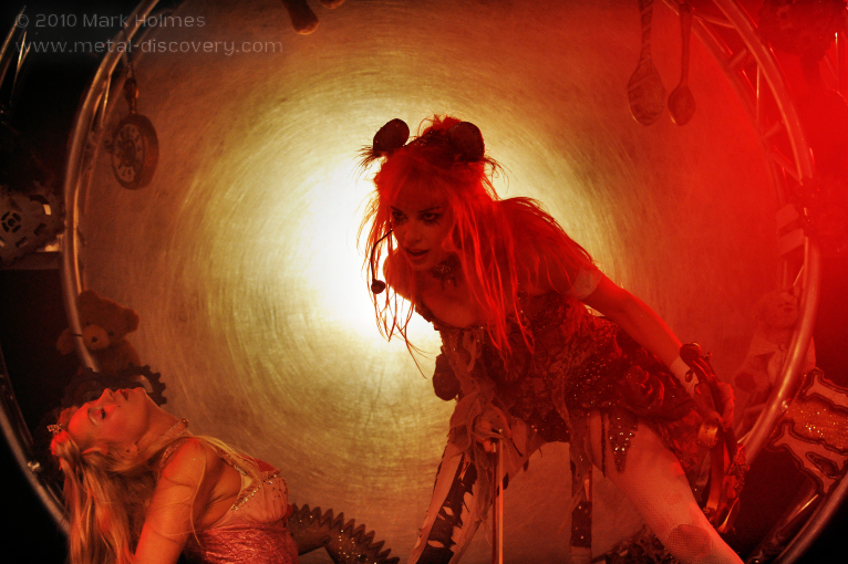 Upon entering Rock City this evening an hour prior to the scheduled show time, tunes of yore play through the PA - the aura is that of a Victorian music hall rather than a rock venue; a clever device in that the feeling is one of entering Emilie's world from the offset. As the lights dim just after 7pm, the three Bloody Crumpets currently on 'The Asylum' tour, namely Aprella, Veronica and Contessa, appear as silhouettes one at a time, backlit behind a circular screen within a clock frame (reminiscent of a prop from Jim Henson's 1986 David Bowie movie 'Labyrinth'), before venturing out onto the stage to be greeted with huge cheers from an enthusiastic audience. Then, Emilie herself appears, also in silhouette, evidently masked, and strikes several 'sinister' poses with the effect of a Murnau-esque expressionist nightmare in the context of a Victorian shadow theatre. Industrial beats resonate poundingly around the venue as the mechanics of The Asylum grind slowly to life. This signifies the beginning of the evening's first song, '4 o'Clock', a hauntingly melancholic number about insomnia and incarceration, an apposite opening piece that works as an 'in' to The Asylum. Now the audience are well and truly within Emilie's world and what ensues is a two and a half hour show incorporating spoken narrative, burlesque performance, elements of carnivalesque theatre and, of course, at the heart of the show, the emotionally varied soundscapes that comprise her 'Victoriandustrial' musical aesthetic. In fact, narrative concepts and concomitant music are married in perfect unison throughout as Emilie's life experiences are laid bear, sometimes metaphorical, but other times more blatant, with the overall effect more akin to that of a musical than rock gig. That is to say, a subversive musical which conveys a similar anti-repressive vibe to a Richard O'Brien production, although I resist from drawing any further parallels to the likes of 'Rocky Horror...' as Emilie's show is an innovatively unique experience in its own right.