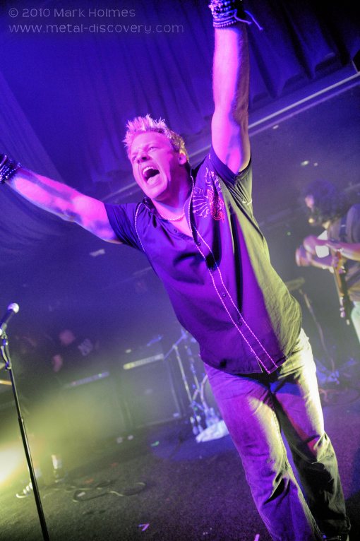 With doors opening at 6:30pm and four bands scheduled to play by a strict 10pm curfew, it's no surprise to see The Jokers in action just ten minutes later and performing to a half full venue. Despite their chosen moniker, there is nothing verging on a joke about these Brits who play some seriously catchy, mainly up tempo, blues flavoured classic rock balanced with a more modern sounding groove. From opening number 'V.I.B.E.' to set closer 'Jamie Jane', they put on a classy display of high energy rocking fury, consolidating the evidently apt title of their debut album, 'The Big Rock & Roll Show'. Admittedly, The Jokers' compositions are not the most original of tunes, but if you're a band who set out to pastiche another style of music so emphatically, then this is how it should be done - with a hundred per cent conviction. The menacing mask of bass player Jokers Jet could be construed by some as a little misplaced alongside their chosen musical path but I find that his sinister gaze works well within the band's predominantly classic rock sound, adding a little bit of a sharper edge to their otherwise more traditional appearance, in the same way that their music is spiced with a few contemporary elements here and there. Vocalist Wane Parry has a versatile voice and, delivering a note-perfect performance, also knows how and when to strike all the right poses. Overall, an enjoyable opening to the evening.