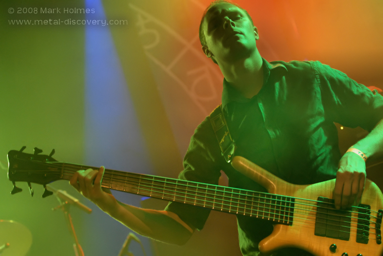 Dutch prog-rockers 21 Eyes of Ruby, largely unknown outside of their home country, open the final day of ProgPower at around 1:45pm. Citing influences such as Smashing Pumpkins, Tool, and The Mars Volta, their musical stylings make them quite different from most other bands on ProgPower's 2008 bill. Emerging on stage to atmospheric intro music, the three-piece have a novel formation which sees drummer Martijn Soeterbroek located at the front-right side, frontman Antoine ‘TuWann’ Pütz on the left, while bassist Alex van Damme occupies the middle space which he fills with a wildly energetic performance. Pütz, with a progressive 2-tone hair-do, is a likeable frontman, although has a few tuning issues on some vocals as he is sporadically flat/sharp throughout the band's set. He also demonstrates ignorance to the festival's wide international attendance by opting to speak to the audience in Dutch between each song which leaves many blank faces in the crowd. Otherwise, the band provide a solid opening to the day's proceedings with a impressively dynamic stage presence in their early afternoon slot.