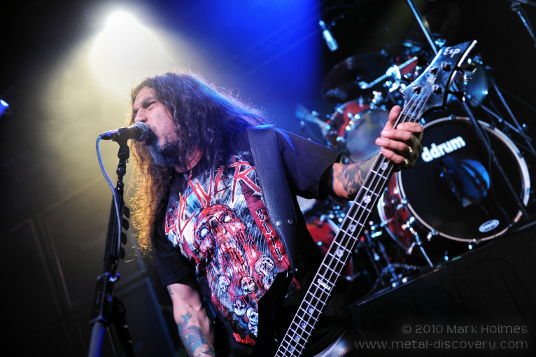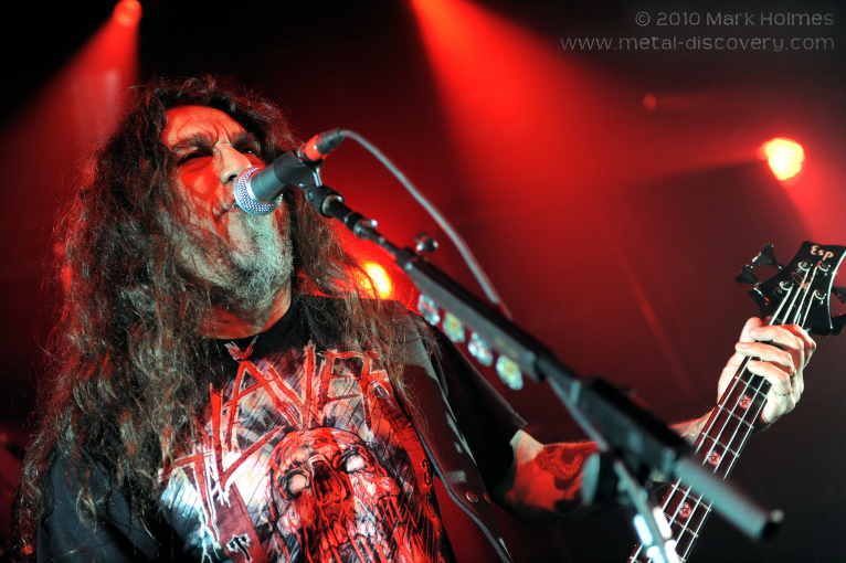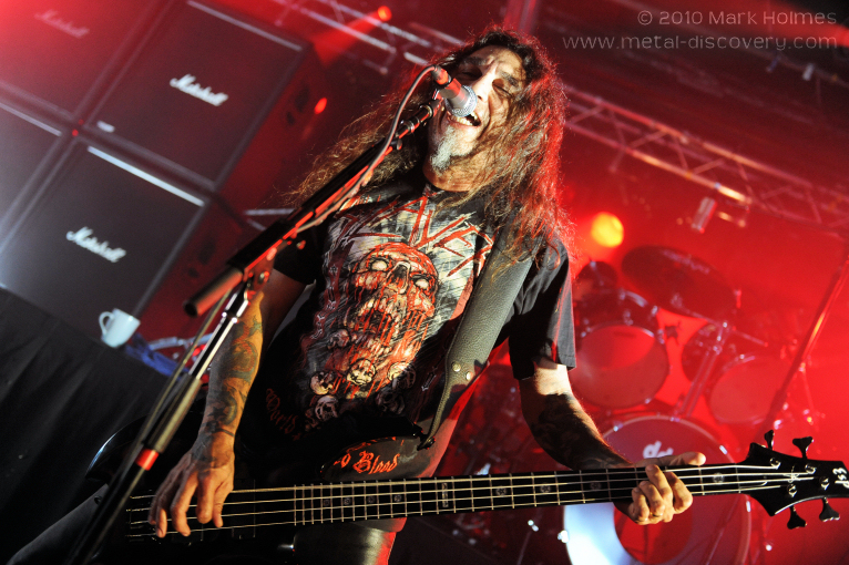 I seem to recall that when Slayer were last on these shores for a headline tour a couple of years back it was for a string of arena shows. It is, therefore, surprising to see them perform in the likes of Rock City with a capacity of around 1,900. It is no surprise, however, that tonight has been sold out for some time, particularly with the two postponements rendering this UK tour taking place six months after it was originally scheduled. As roadies prep the stage for the thrash titans those who eagerly wait in a rammed, hot and sweaty venue sporadically burst into chants of "Slayer...Slayer...Slayer" in anticipation of their arrival. When the lights dim, the chants transform into deafening cheers as an extended version of the intro from the band's new album's title track, 'World Painted Blood', plays through the PA. Then Tom Araya, Kerry King, Jeff Hanneman and Dave Lombardo walk out to even more boisterous roars and King plays the opening palm-muted riff of the track before his three band mates join the full-on sonic attack on the audience's ears. The audience discernibly burst with excitement as crowd surfers are incessantly pulled out by security into the photopit. And the sound through the PA is refreshingly resonant and crisp - all instruments/vocals have perfect clarity; last year's no expense spared revamp of the venue's sound and lighting infrastructure has certainly become more and more noticeable at gigs here in recent months. Well, lighting-wise Slayer have opted to bring much of their own too with a series of moving heads placed strategically around the stage, atmospherically illuminating band members through the smoke machine's constant expulsions. Araya, who is on doctors orders not to headbang, is perhaps the most subdued onstage, although Hanneman and King, stage left and stage right respectively, do bang their heads to the up tempo beat of each track played, and Lombardo remains animated behind his kit throughout with his virtuoso drumming. Their chosen setlist is obviously out to please the diehard Slayer afficionado with tracks from the latest album kept to a minimum (only 'Hate Worldwide and 'Beauty Through Order' are aired in addition to the aforementioned title track) in favour of a string of classic numbers such as 'Seasons in the Abyss', 'War Ensemble', 'Hell Awaits', 'Mandatory Suicide', 'Chemical Warfare', 'Raining Blood', 'Aggressive Perfector', and 'South of Heaven'. The 1,900 fans in attendance lap up every bar of music with the expected pit mayhem, which peaks and emphatically erupts during final encore song 'Angel of Death'. I can reassuringly report that, in 2010, Slayer remain a monstrous live act. Thank fuck. And after tonight's masterful show in Nottingham I'm sure that few present would disagree. Classic songs, flawlessly performed, by metal legends. What else needs to be said? Awesome.