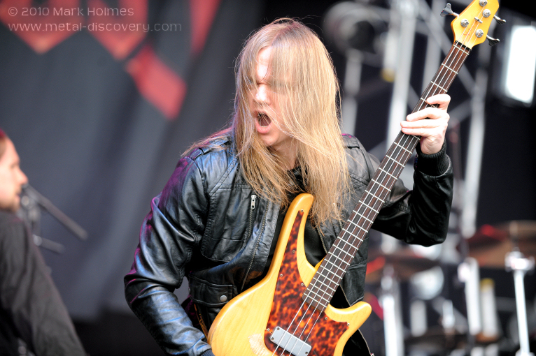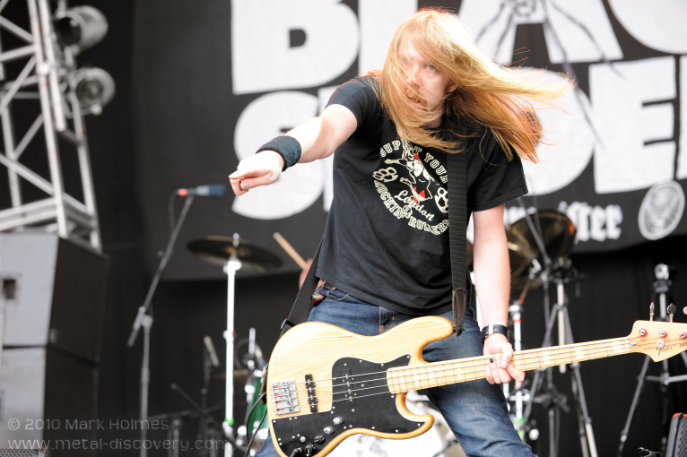 Arriving on site at 11am for Bloodstock Open Air 2010's first day I unfortunately miss opening band Snakebite's entire set so Brit rockers Black Spiders kick off the festival action for me. And, on an overcast day that has threatened rain since dawn, Friday's first downpour begins to soak the largish audience present in front of the main stage as band members wander out after a short intro piece to huge cheers. Making the most of their half hour set, they commence with 'Si, El Diablo'. Stoner riffage with retro rock infusions fill the air as Black Spiders stride and stomp their way around the stage in a display of raw rock 'n' roll energy that defies their early timeslot, and undoubtedly serves as a wakeup call for the late risers who are slowly appearing in the main arena. Frontman Pete 'Spider' Spiby delivers a strong and authoritative vocal performance while bassist Adam 'The Fox' Irwin also impresses with an array of wild moves (clichéd as some of them are, although perhaps apposite for the band's compositionally retro approach). The amusingly named 'Kiss Tried To Kill Me (It Was Gene Not Paul)' is preceded with a brief 'explanation' as to the ambiguity inherent in the track's title while closer 'Blood of the Kings' brings matters to a conclusion as Black Spiders exit the stage to even louder audience noise to which they appeared half an hour previously. And half an hour feels like about the right length for such music on the festival stage - a short burst of energetic, retro fun to alleviate the increasingly damp feeling as showers continue to soak all present at Catton Hall. (MH)