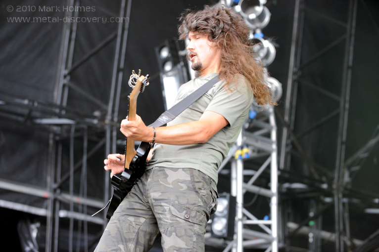 From memory, Ross the Boss were the first band to be announced for Bloodstock's tenth anniversary lineup, and it was an announcement that excited some seeing as Manowar have been incessantly requested to be booked for the festival during the past few years and their personnel includes ex-Manowar/ex-The Dictators axeman Ross Friedman. Introduced onstage as a "true metal legend" (for Ross the Boss is also Friedman's moniker as well as a band name, thus the laudatory announcement evidently refers just to him, not his band), the day hits noon as the "legend" Friedman and his fellow musicians appear onstage. His comrades in this current venture are onetime German Manowar cover band Men of War and one could argue they remain as such today with four Manowar tracks in their forty minute set and a guest appearance midway through proceedings from Scott Columbus on a second drum kit. However, they balance out the likes of 'Hail To England' and 'Kill With Power' with a scattering of their own, original material as well as a tribute to Ronnie James Dio in the form of penultimate number 'Catch The Rainbow'. As much of a stage presence as the 'band' have, and as good a job they do of working the crowd into their first real movement of the day, their performance is significantly flawed by a discernibly bass heavy mix through the PA and frontman Patrick Fuchs' substandard performance as he warbles his way through each song, largely in tune but sporadically missing certain notes. For someone who has never really 'got' Manowar and their fantasy pseudo-macho aesthetic, I guess today's 'tribute' is largely lost on me, although judging by audience reactions, many present seem satisfied by what they witness, despite the bass-heavy sound and Fuchs' tuning issues. (MH)