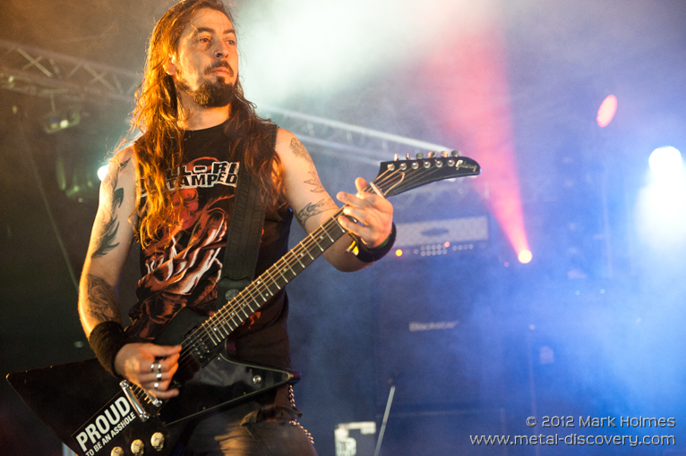 Making a welcome return to the Sophie stage after playing Bloodstock in 2010, and playing to an absolutely rammed tent are Mancunian ‘English Heritage Black Metallers’ (self-coined by the band), Winterfylleth. A refreshingly rare breed of black metal for this weekend, without dodgy corpse paint or dressed like your average metal band and without the over-the-top stage theatrics employed by most of said bands, Winterfylleth effortlessly gain full respect of all in attendance with their atmospheric, folk-tinged songs inspired by traditional English heritage and culture. Whereas other British bands of the genre seem to regularly stall in their efforts to grow and develop as a band, Winterfylleth, over the years, have been favoured with rave press reviews, a bigger and better record deal with Candlelight, and travels across the waters to play the European metal fests, and with their third full length album, ‘The Threnody of Triumph’ shortly to be released through said record label, from which they play ‘Void of Light’ in today’s set. Despite my brief absence to watch a little of a band on the New Blood Stage before returning to see the rest of their set, Winterfylleth play a slick and enjoyable set, and one that leaves me intrigued to see them again. Impressive stuff. (HS)