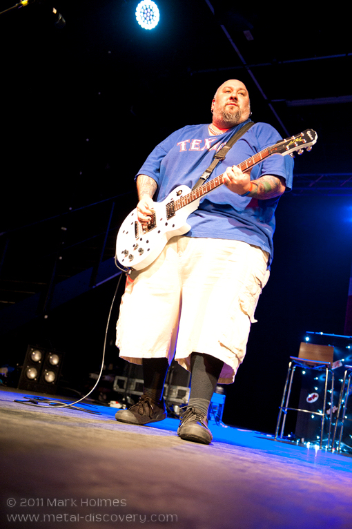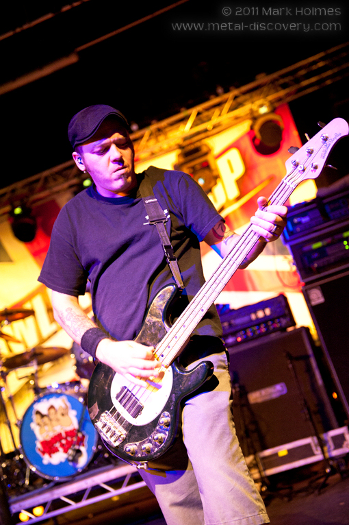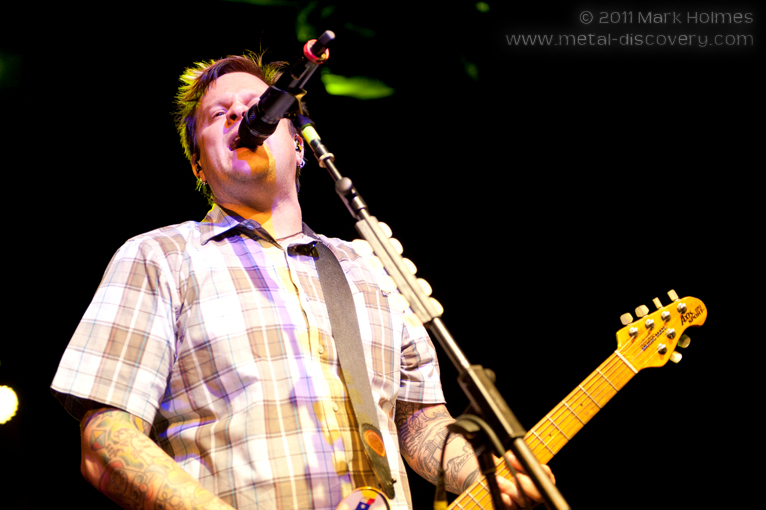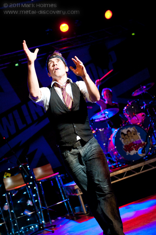 Whether you choose to generically classify their musical output as punk rock or, as it is more commonly perceived, pop punk, one cannot deny that Bowling For Soup are always an entertaining live band with the emphasis on fun for both the musicians and audience. And tonight is no exception as their thirteen date 2011 UK tour stops off in Lincoln. Opening with a duo of tracks from 2006 album 'The Great Burrito Extortion Case', namely 'I'm Gay' and 'High School Never Ends', which are swiftly followed by 'S-S-S-Saturday' from new release 'Fishin' for Woos', Bowling For Soup are on fine form with frontman Jaret Reddick pulling all manner of gurns and grins at onlookers between singing parts. With guitarist Chris Burney fairly static in his stage presence, it's perhaps a step-down from the energy levels sustained throughout Suburban Legends' performance but this seems to matter not for the audience who jump up and down en masse to Bowling For Soup's songs as many voice the words to every track played. Aside from the music, entertainment is also offered in the form of comedic between-song banter as band members exchange witty remarks with each other and the crowd. A couple of bras are hurled onto the stage throughout the night, the first of which provides the source of much jesting for four or five songs. They finish playing each track and the bra is up for discussion again including speculation as to whether it came off a "confused little boy" and bassist Erik Chandler wears it around his head for an entire song, saying that as it's such a tight fit he's concerned about the size of the person it belongs to as well as stating it's "the nicest fragrance I've had surrounding my head since we started this tour!". The hits come thick and fast including the expected inclusions of 'Punk Rock 101', 'Almost' and their cover of SR-71's '1985', and the band even take a break from proceedings as they all gather by the back of the stage at their personalised bar area which is occupied by three girls sat on stools for most of the night (competition winners perhaps?). Suburban Legends' brass section appear back on stage to add trumpet and trombone to 'Belgium' before a cover of Bryan Adams' 'Summer of '69' ends their set. The obligatory gig formality of stage exit, cheers for more, and a reappearance leads to an encore airing of 'Girl All the Bad Guys Want'. To be blatantly honest, the whole pop punk (or whatever you choose to call it) movement has never really struck a chord with me in its recorded form but, on the live stage, for a night of unmitigated musical revelry and impromptu jesting, it doesn't get much better than Bowling For Soup.