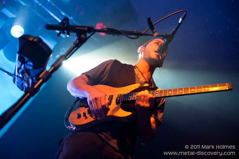 With French metallers Hypno5e pulling out of the tour at the eleventh hour, proceedings get off to a later than anticipated start and Chimp Spanner provide a packed Garage with their first action of the night. The brainchild of Essex based musician Paul Oritz, Chimp Spanner was originally conceived as an instrumental prog-metal solo project but, assembling a lineup of skilled players, he took it out of the studio earlier this year to tour with Aliases in April, TesseracT in September and now Cynic in December. Appearing on a heavily backlit stage, one could be forgiven for thinking that Paul Masvidal has walked out prematurely as Oritz, in silhouette, bears more than a passing resemblance to the Cynic frontman with similar hair and stubble. Demonstrating impressive virtuosic command of his seven and eight string Ibanez guitars, along with his fellow musicians, Oritz treats the audience to a sonic barrage of down-tuned tech-metal mastery with occasional ambient interludes. With the low tones of some Meshuggah style polyrhythms, tunes suffer slightly from a lack of variance on occasion although punctuated with widdly lead flourishes helps colour their musical canvas. Ultimately, Chimp Spanner are thoroughly engaging when at their most riveting but I find myself a little distanced from the music at times, merely admiring the musicians' high skill level and technical prowess rather than encompassed by it. It's still a mightily impressive set though.