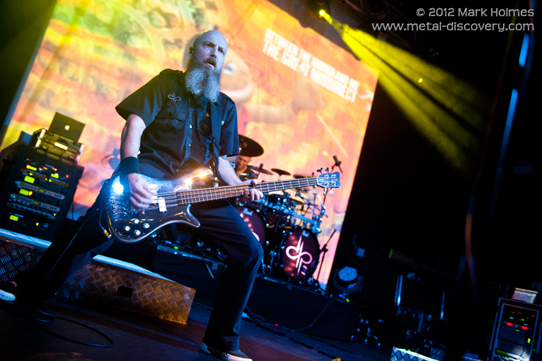 The setlist is a pleasingly varied one with a nicely balanced mix of the old and the new to please established fans and newcomers alike with one or two surprises thrown in along the way. Five songs are from latest album 'Epicloud', including the debut live airing of 'Save Our Now' and what's fast becoming the ultimate Devin party track, 'Lucky Animals' (complete with audience participation with a ubiquitous display of "jazz hands" in the air for every utterance of the "and they're lucky" lyric). 'Infinity' numbers 'Truth' and 'War' are more than welcome (a sentiment shared by many judging by audience reactions), 'Planet of the Apes'/'Juular' from 'Deconstruction' also incite mass crowd movement, as does the ever-popular 'Vampira'. And it's always an utter pleasure to hear 'Deep Peace' in a live context with its mellower build-up towards Devin's emotionally captivating neo-classical leads. A burst of up-tempo 'Epicloud' rock wraps up a pre-encore set in the form of 'Liberation' before amusing band introductions (including the proclamation that guitarist Dave Young's beard isn't actually that big, rather it's mainly a huge chin with a little bit of stubble), the aforementioned 'Save Our Now' and then party-piece 'Bad Devil'. Devin invites a couple of peeps from the audience up onto the stage during the latter, one dressed as a banana and, aptly, one as the devil, and at the track's climax (complete with Maiden-esque outro), he looks into the crowd and says, "I forgot about bunny rabbit!", so up hops the rabbit too. With a strict venue curfew of 10pm tonight, it's at least ten minutes over that by the time the DTP finish but who would've dared stop the party? It's a shame it has to stop when it does but all good things must come to an end and with nearly an hour and a half of the DTP, preceded as they were by the industrial metal might of Fear Factory, it's undoubtedly been one of the gigs of the year and the most awesome of ways to end another gigging year as 2012 nears its end. (MH)
