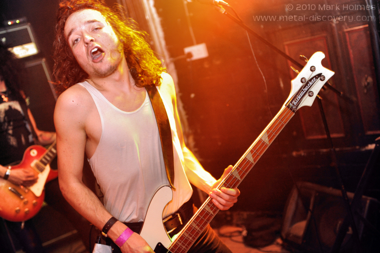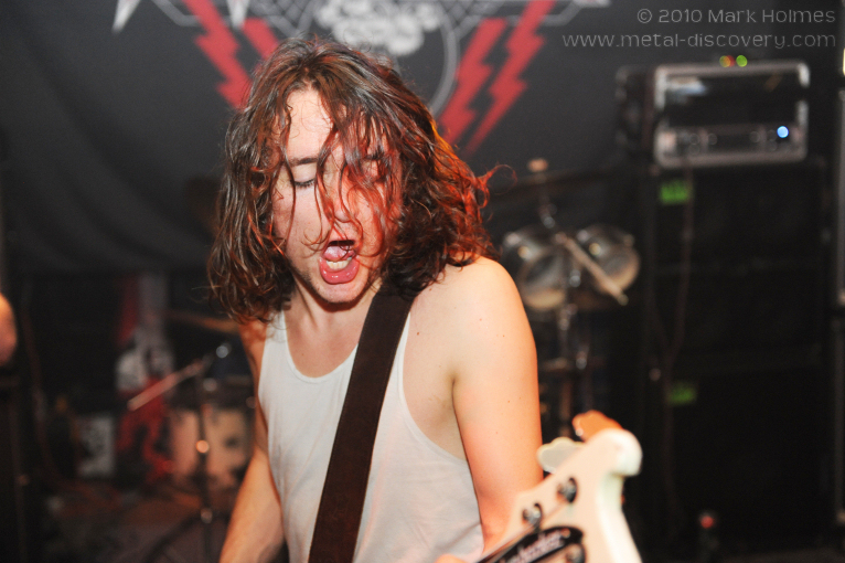 It's kind of ironic at a metal label's party with four bands performing that the largest crowd of the night materialises when three semi-naked ladies take to the small platform by the side of the stage area to strut their stuff to the accompaniment of rock/metal tracks. That's to be expected though, I guess, and The Sirens provide a jovial break in the evening's proceedings. Each of the women take it in turn to perform a solo semi-strip routine which generally involves pouring a range of alcohol (and milk) over their own bodies and the crowd, and it's as much fun observing expressions on spectators' faces as well as The Sirens themselves. Their fifteen minute stint climaxes with the three girls engaged in a pillow fight as feathers fill the air in what is a rather aesthetically enchanting scene. And it's astonishing how many feathers a couple of pillows shed as both floor and punters are covered in the damn things for the remainder of the night - a telling sign as to who had a prime viewing position for the ladies' performance! Seemingly making a name for themselves within the metal scene, they've also been booked for 2011's Bloodstock Open Air. Vivacious, fun and irresistably seductive - make sure you check 'em out!