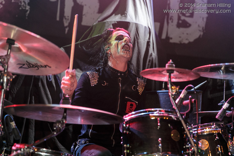 The first band this evening are The Killing Lights from LA. Having only changed their name towards the end of 2013, you might be more familiar with them as Vampires Everywhere! Fitting into this evening's bill perfectly they play a set of songs that don't neatly fit into any one genre; there's a fair helping of punk but this is tempered by metal and even hardcore in places. The result is not unpleasant either! Lots of energy, vocalist Michael V looking suitably demented for most of the short set. Driven along impressively in the main part by the accomplished drumming of J.J. Gun (lots of stick twirls and other such drum frickery!) there is a lot to like here and, despite the fact that they're barely on stage for 25 minutes, they definitely make an impression on the assembled masses, much nodding and smiles!