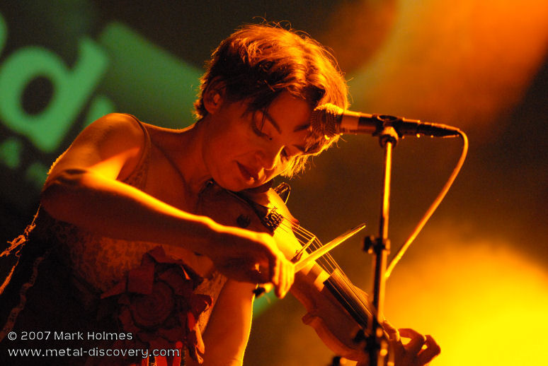 I'd not heard of American band Sleepytime Gorilla Museum prior to this evening so had absolutely no idea what to expect. Apart from Canada, tonight marks their first show outside of the States. A few minutes before they begin, the curtains are drawn to reveal the band on stage, still soundchecking, and dressed in unusual dungaree/dress style outfits and face paint/makeup. What follows is an hour long set of incredibly original music coupled with an eccentric, almost theatrical performance. I shall not even attempt to describe their music as no text will do it justice, but there are some heavy guitar parts; male/female vocals; incessantly changing time signatures; alternately discordant and melodious violin; plus a whole array of unusual and interesting sounds. Apart from the conventional guitar, bass, drums etc, SGM play a lot of homemade instruments including bassist Dan Rathbun's Slide-piano Log, which he uses near the beginning of their set. It appears to be built from a long piece of wood (a few feet in length) and piano strings, which he plays using 2 sticks. Each song played is preceded by short bizarre introductions by vocalist/guitarist Nils Frykdahl that are almost nonsensical, though apt for SGM's performance. They defy categorisation and are, without a doubt, one of the most original and genuinely progressive bands I've ever seen - SGM are iconoclastic through both their music and live show. They are sublime in their eccentricity and ingenious through their transcendence and make Mike Patton's various musical ventures seem comparatively 'normal' and mainstream. SGM are wonderfully eccentric, versatile in their creativity, wholly original, truly progressive and musically innovative. I cannot recommend this band enough - they are mindblowingly fucking awesome! And I'm not alone in that opinion as many people in P60 rush to the merchandise stall after their performance to buy CDs. Sheer brilliance.