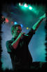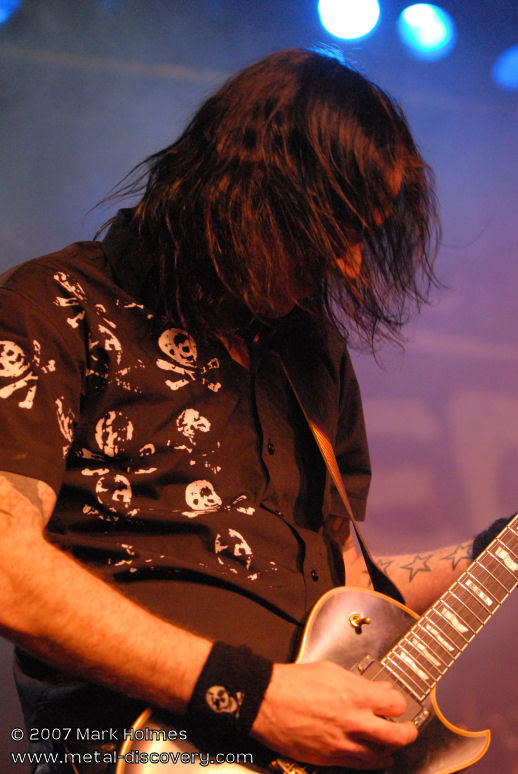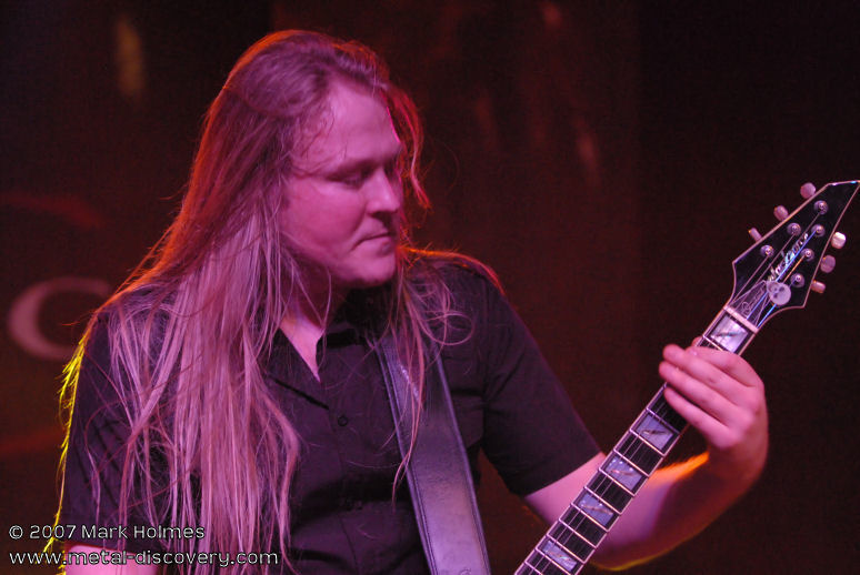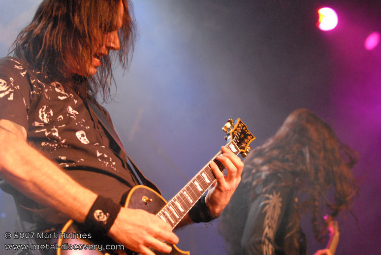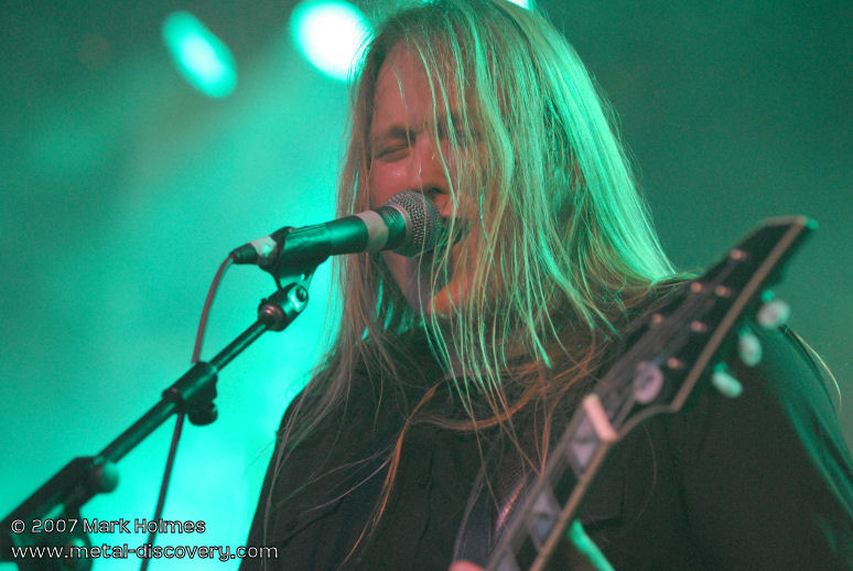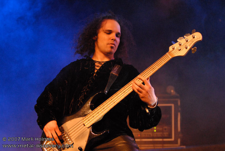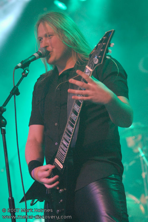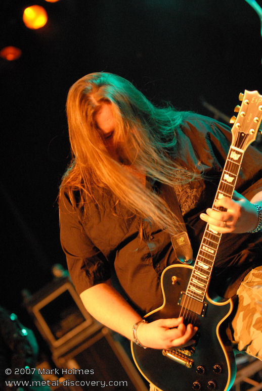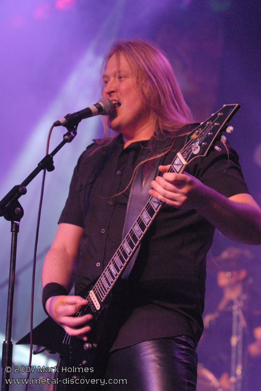 Upon entering the venue, every person is handed a 'goodie bag' (a black carrier bag printed with the Progpower UK logo) generously containing guitar picks; pens; stickers; leaflets; flyers and a whole stack of CD samplers including a 2CD/1 DVD set compiled and created specifically for PPUK II. This is a nice touch, and illustrates the sincerity of the organisers in their caring attitude towards the punters. Another unique feature is the 'guitar duelling' that took place at the Elixir Strings stall over to one side of the metal market. People were invited to jam along to backing tracks with the Elixir demo guy, the prize for the most promising musician being a £550 Lag guitar, which was presented to the lucky winner on stage by Leaves' Eyes vocalist Liv Kristine after Kamelot's set.